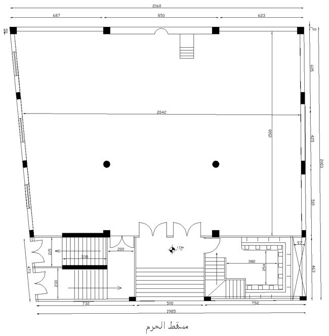وتم تصميم المسجد فوق هذه الأرض بحرم تحت أرضه بمساحة /300/ مترمربع وباقي مساحة الأرض مواضئ ومنافع وأدراج وهذا القسم مخصص للنساء وحرم علوي بمساحة /300/ مترمربع وله سدة بمساحة /220/ مترمربع للرجال